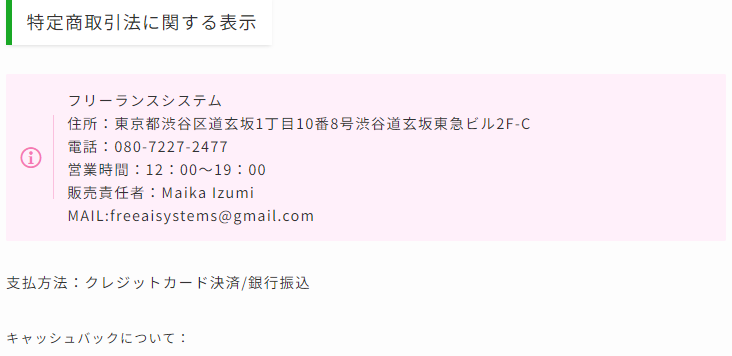 最後に、バブルマネーハンター(物販×史上最大バブル)の特定商取引法がどのように表記されているのかも見ておきましょう。